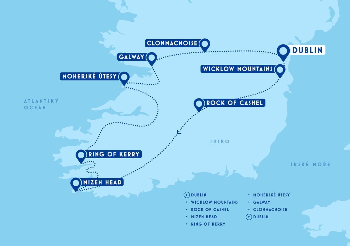 Prejdete sa zeleným srdcom Írska aj dramatickým západným pobrežím. Uvidíte legendárne miesta ako Dublinský hrad, pivovar Guinness alebo majestátne Mohérske útesy. Prejdete sa záhradami Powerscourt, nazriete do keltskej minulosti v Glendalough, navštívite skanzeny, kláštory, hrady aj opustené veže. Ochutnáte pravú írsku whiskey v palírni Jameson. Nechýbajú prechádzky po historických mestách ako Galway, Kilkenny či Cork, ani oddych pri jazerách národného parku Killarney.